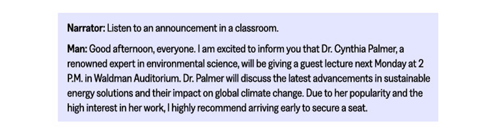 サンプル問題 引用:2026年1月から開始!TOEFL iBT特設ページ - ③Listening to Announcement