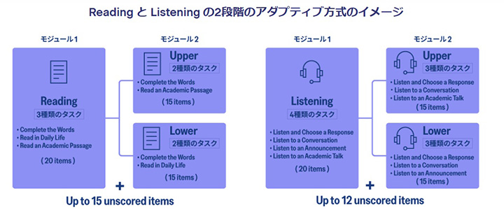まず1つ目の大きな違いとして、リーディングとリスニングの問題は「アダプティブ方式」になります。今まではどのレベルの人も皆同じ問題を解いていましたが、改訂版ではモジュール1の解答成績に応じて、モジュール2の問題難易度がリアルタイムに調整されます。