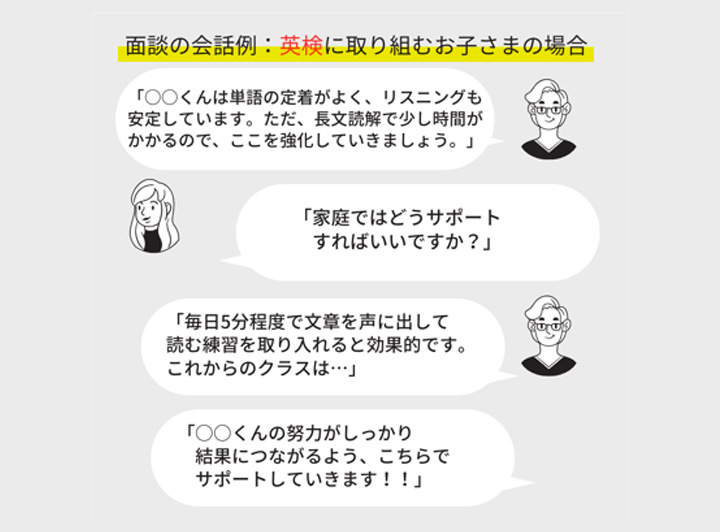 面談では、レッスンでのお子さまの取り組みや理解度をもとに、得意な分野やさらに伸ばしていきたい分野を具体的にお伝えします。また、今後の学習計画や目標も一緒に確認し、家庭でのサポート方法や学習の進め方についてもアドバイスいたします。資格試験対策(英検®・TOEIC®テスト・TOEFL®テストなど)に取り組んでいるお子さまの場合は、目標の見直しや学習上のポイントも共有し、効率的に力を伸ばせる方法を考えます。楽しんで英語学習を続けていただけるように、英会話で楽しさ、資格試験で達成感、成功体験を感じていただけるようお一人お一人に合わせてご提案いたします。