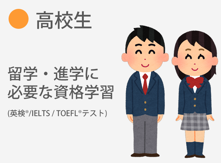 また、海外大学進学や交換留学に欠かせないIELTSやTOEFL(R)テストにも対応。初めての方でも大丈夫。高校生から学ぶことができる初級レベルのIELTS /