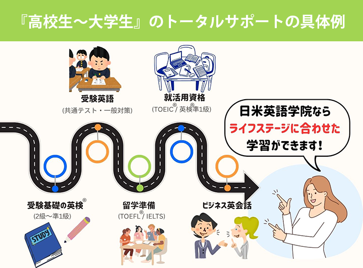 大学受験のために圧倒的にお勉強される方が多い「英検(R)」。英検(R)2級以上を持っていれば、共通テストや各大学の個別試験において得点換算や試験免除などの優遇措置が受けられるところも多いです。日米英語学院なら二次試験の面接対策までばっちり!英検(R)面接官経験のある講師も在籍しています!